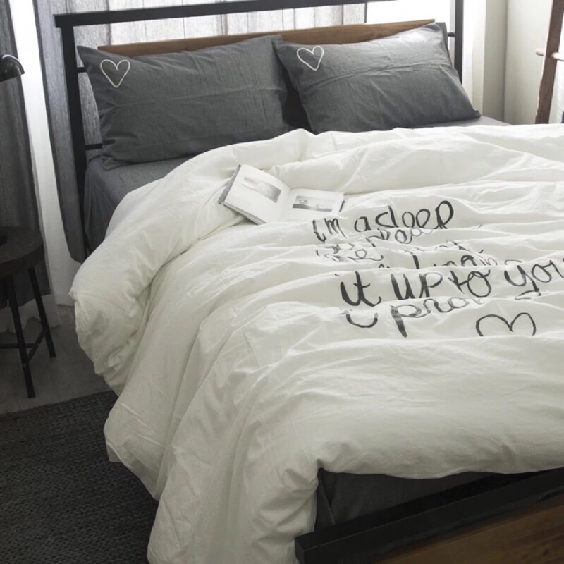 現貨 2色 北歐刺繡英文愛心水洗棉床包組床單被套枕套專櫃純棉兒童專櫃灰色白色ikea床墊尺寸雙人床包 蝦皮購物